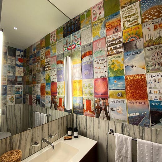 There is also a guest bathroom plastered with New Yorker magazine covers that generated quite the discussion online. Maybe I am just a sterile and boring person but all the funkiness going on in this apartment is too much for me. I love colors and colorful décor but a wall of magazines against a bamboo-like marble slab is too much texture for my brain to handle. I think that’s what is confusing me a little bit – the eclectic mix of textures and styles are a little too mismatched for my personal taste. But it’s working for Gigi, and I certainly like it more than Kim Kardashian’s mausoleum-like mansion or Justin Bieber’s former… whatever this is.