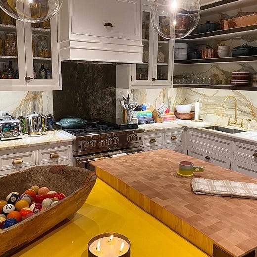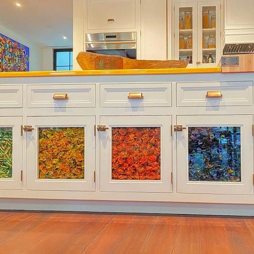 One that stood out in particular was a kitchen cabinet with colored pasta. I don’t really know how to explain it other than that the glass panel doors of some cabinets on the island of her kitchen are filled and decorated with loose fusilli and farfalle that have been dyed in garish blues and oranges. I’ve seen some people say how cool and creative the idea is but I just can’t get on board with it. I’m sorry, I guess I am not cool enough to appreciate the artistry.