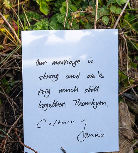 When news of the affair first broke, Dominic immediately left Rome and returned to the UK to make amends with his wife and schedule some photo ops of the two looking happy together. It was really odd, to be honest. As you can see in the tweet above, the photo op included this handwritten note that Catherine passed on to the paparazzi stationed outside their house, declaring that their marriage is "strong" and denying rumors of a separation. A very convincing touch to the performance, of course.